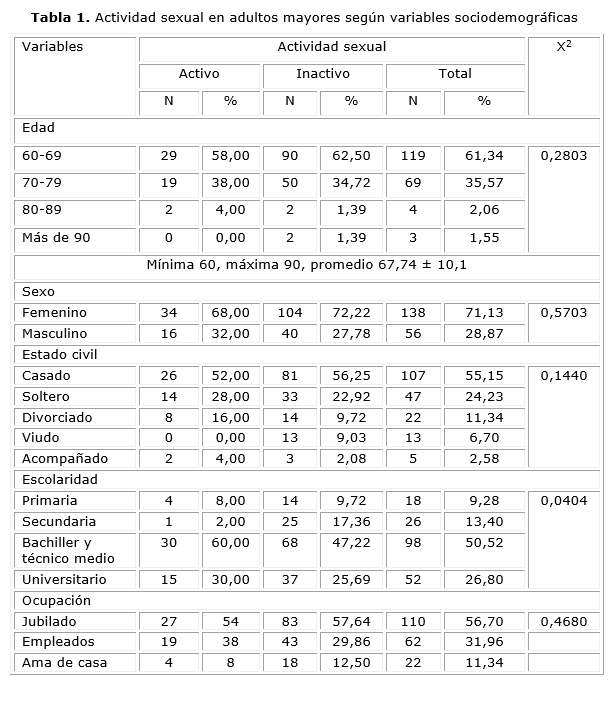 De 194 personas mayores estudiadas, 144 personas mayores presentaban actividad sexual inactiva para el 74,23 %.