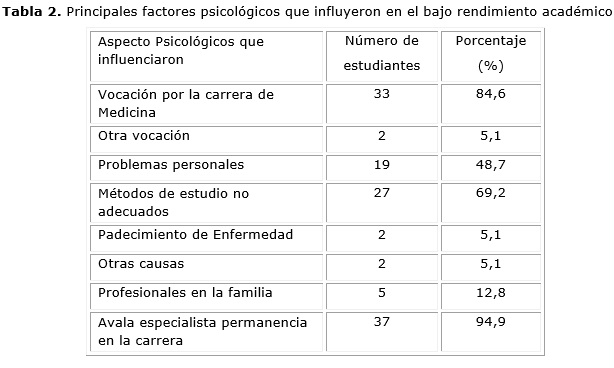 Se realizó un estudio descriptivo con seguimiento académico de corto plazo en la Facultad de Ciencias Médicas "Calixto García", con el propósito de caracterizar desde el punto de vista psicológico los factores que influyeron en el bajo rendimiento académico de estudiantes repitentes y reingreso, el análisis de la promoción de las asignaturas de ciencias básicas, en el segundo período, forma parte del mismo proceso evaluativo institucional.